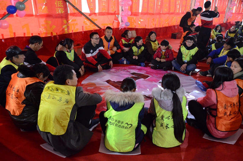 活动参与者共分为20个小组,以组为单位构建团队参与各项活动。在团队中,家长和孩子是分开的,每位家长把别人的孩子当做自己的孩子,孩子也把别人的家长当做自己的爸爸妈妈,成为一天的临时搭档,极大地促进了队员之间的沟通和交流。本次公益活动环节设计精心,形式多样。以热热闹闹的“排长龙”开始,以充满温情的“蓝丝带”结束,为期一天的活动丰富多彩。在场的学生和家长、老师都放下了平时的身份和角色,回到了最基本的人与人之间的关系,学习接纳、关心、爱护,体会沟通、信任和欣赏的力量。