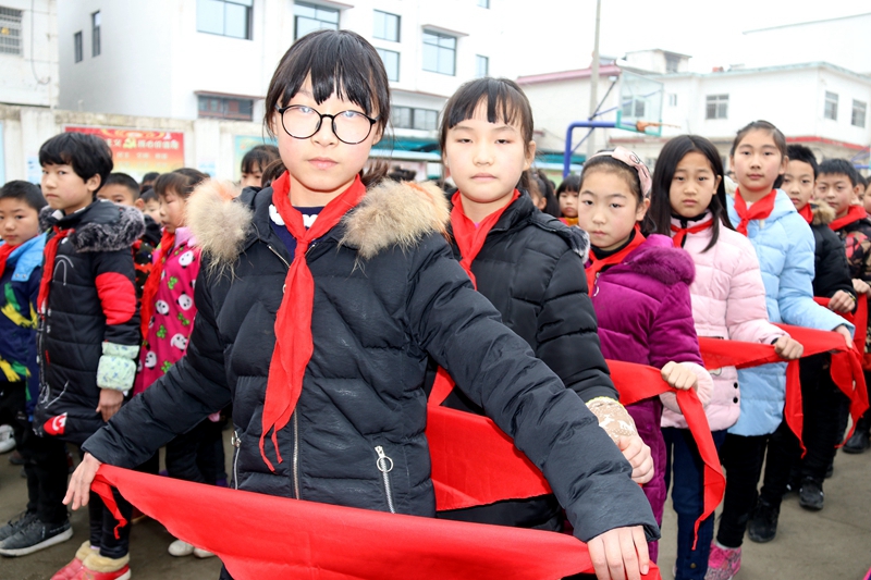 少先队员们为出席领导和爱心人士佩戴红领巾
