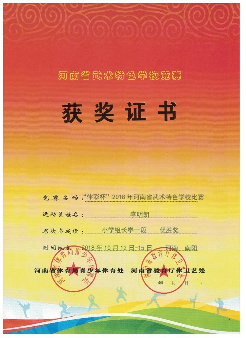 在2018年河南省特色武术学校比赛中,获得了女子小学组其他少林拳优胜奖;小学组趣味武术健身操优胜奖小学组长拳,一段优胜奖。她表演的武术节目还在河南电视台新农村频道进行了播放。