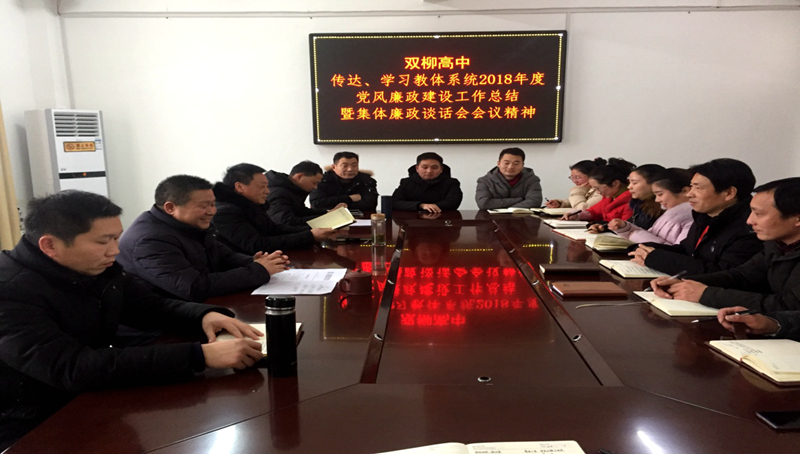潢川网1月7日讯(杨永福)2019年1月7日下午,潢川县双柳高中全体党员干部在学校敬德楼会议室召开会议,传达、学习教体系统2018年度党风廉政建设工作总结暨集体廉政谈话会会议精神。会议由双柳高中党支部书记彭长国主持。
