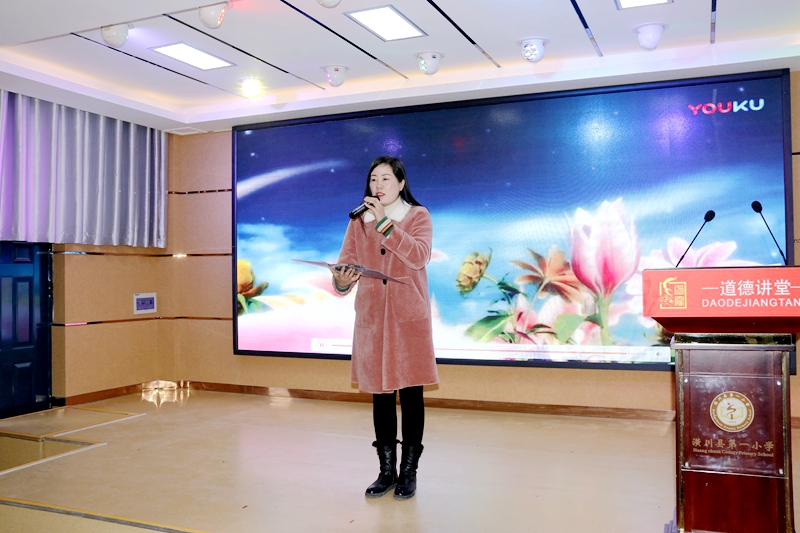 活动在李玫琼、吴灿灿两位老师与学生合唱队共同演唱的歌曲《苔》中拉开了序幕,歌曲唱出了小人物大作为的担当;主持人带领全体教师齐声诵读了《师说》中的经典名句;短片《最美教师李芳》的感人事迹深深得震撼了现场每一个人的心灵;现场还进行了诗朗诵《我是一名小学教师》;教师代表高俊艺、黄云、孙孝晶、刘静、苗华燕、谷中华分享了工作中的点点滴滴,他们的高尚情怀、坚定信念赢得台下热烈的掌声,许多教师更是留下了感动的泪水;张静等老师结合优秀教师的先进事迹与大家共同分享了思想上的感悟;副校长赵素霞带领全体教师作出庄严承诺,加强师德修养,树立道德新风,提升学科素养,做好本职工作,争当师德的先锋;校长黄万龙以《当四有好老师做好学生引路人》为题,为大家讲党课,他结合新时代对教师提出的新要求,列举了大量的事例和感人的故事,使大家对教师的职责有了更加清醒的认识,激发了老师们以更高的工作标准、更强的工作作风、更好的工作成效投入到教育教学工作中,全面提升一小教育质量,做好学生引路人的决心;县教体局党组成员喻新峰对本次道德讲堂进行了点评,对全体教师提出了新的希望和要求。