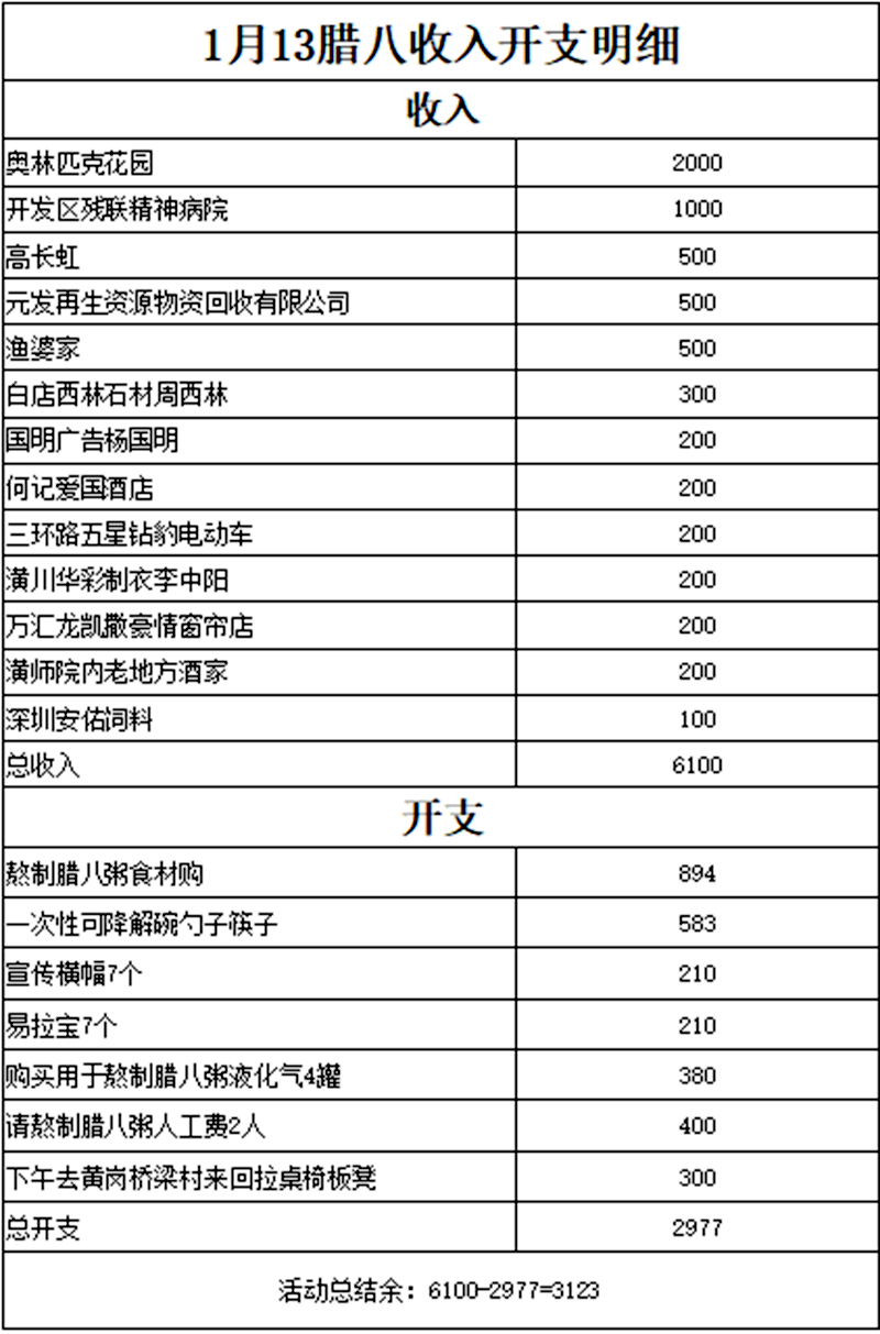 本次活动账目明细展示结余款转入下次活动中使用,所有开支与结余接受社会监督