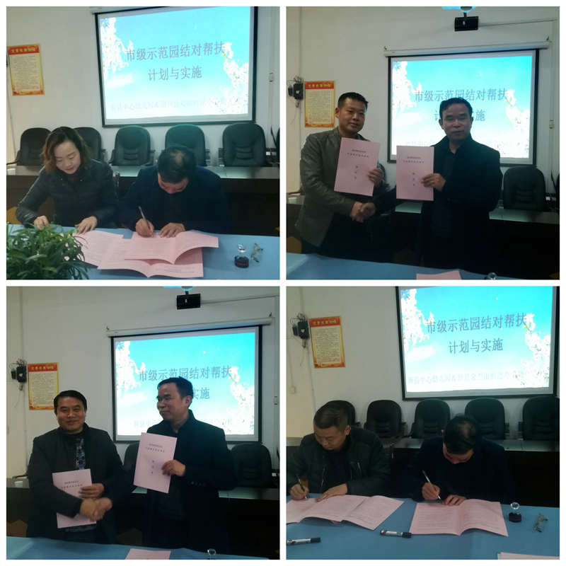 首先,新县中心幼儿园园长谢复春致欢迎词,并简单介绍了幼儿园的发展历程,使结对园所对幼儿园有了初步了解。随后,中心幼儿园朱晓玲园长宣读了本次结对帮扶的具体实施方案。紧接着,双柳中心幼儿园的徐园长介绍了我们园所的概况,并表达了帮扶愿望。最后,在充分交流沟通后,双方正式签署结对帮扶协议书。