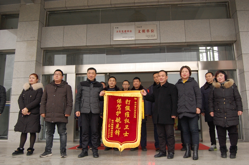 潢川网1月28日讯 2019年1月28日下午,潢川鹏胜酒业经营部向潢川县工商质监局赠送了一面印有“打假维权卫士,保障护航先锋”字样的锦旗,对我局护企维权、高效执法表示感谢。