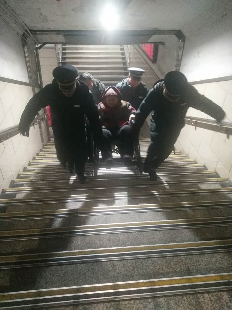 图为1月29日20:51分,潢川火车站当班客运值班员岳俊杰、涂敏和客运员王利军共同帮助K823次重点旅客上车。
