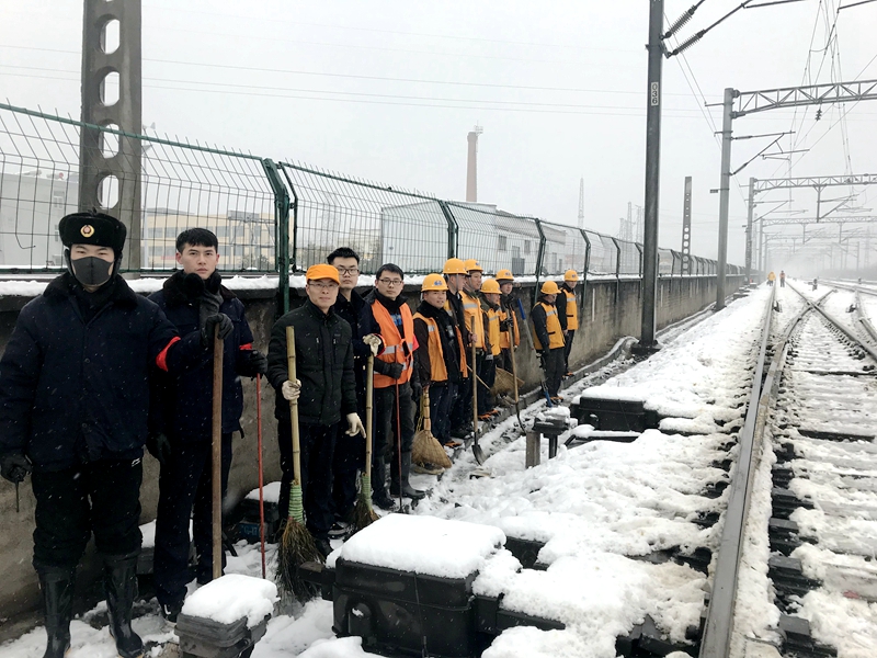 在此次抗风雪的过程中,有这样一只特殊的青年队伍,他们是车站运转三班,平均年龄只有26岁。在刚下夜班的情况下,他们却主动申请参加除雪保畅通工作。在车站运转主任黄勇的带领下,他们积极奋战在线路道岔上,将车站北端30多副道岔都进行仔细清扫,同时,也有其他单位电务和工务部门进行为道岔涂油与清扫,确保车站道岔正常运行,保障铁路运输安全畅通。