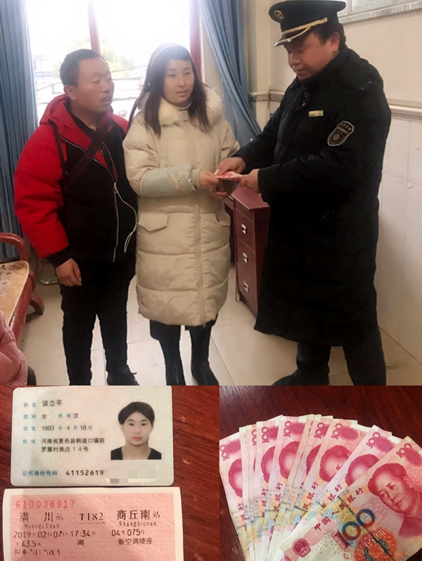 15分钟后,一名河南夏邑县谈立平旅客带着丈夫和女儿来到客运值班室认领丢失的钱包,里面不仅有一千四百元现金,还有返程的车票。在对自己粗心的同时并连声致谢工作人员,青年党员霍磊磊:“这是我们应该做的,希望让你的出行更加温暖。”