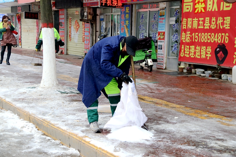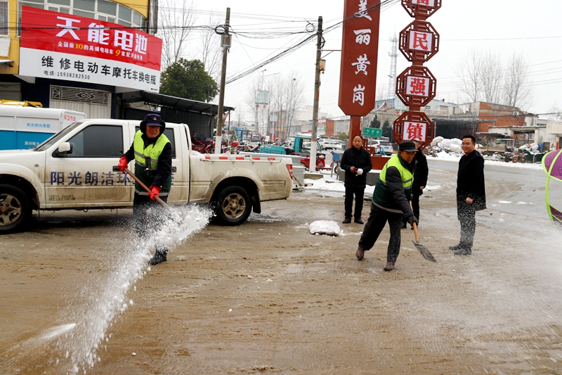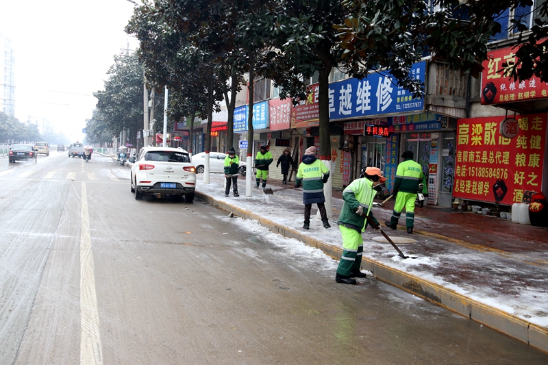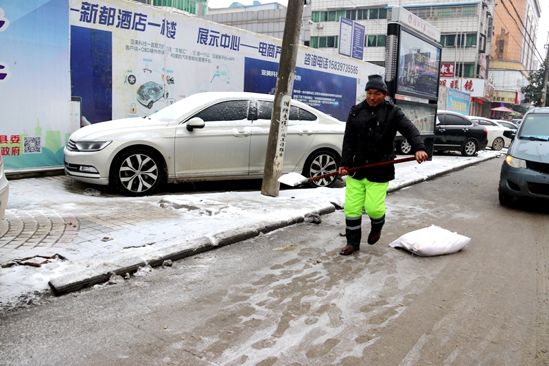 10日上午,在跃进路和桂花园路上,在县城管局班子成员温建军的现场指挥下,一线环卫工人挥舞着雪铲、不畏严寒、相互配合、齐心协力,对沿街人行道积雪进行撒盐清理,同时,这种场面在黄寺岗镇等各乡镇首集同步上演,为寒冷的春节增添了另一种美丽。