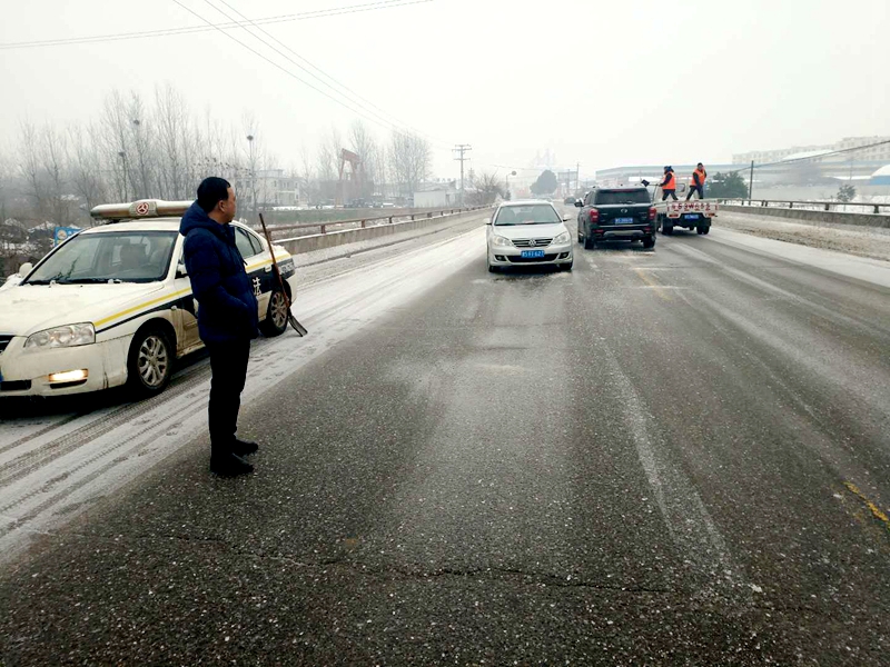 在G312线丁大堰桥面上,县交通运输局党组成员、公路局局长张强亲自上路巡查除冰工作 ,要求养护人员合理安排工作 时间,加大机械化作业……