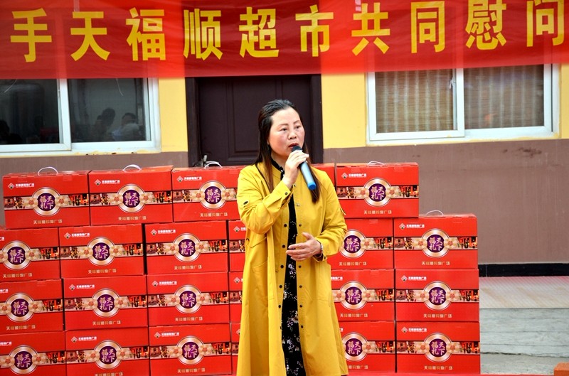 潢川县天福顺购物广场总经理王素华代表爱心企业讲话
