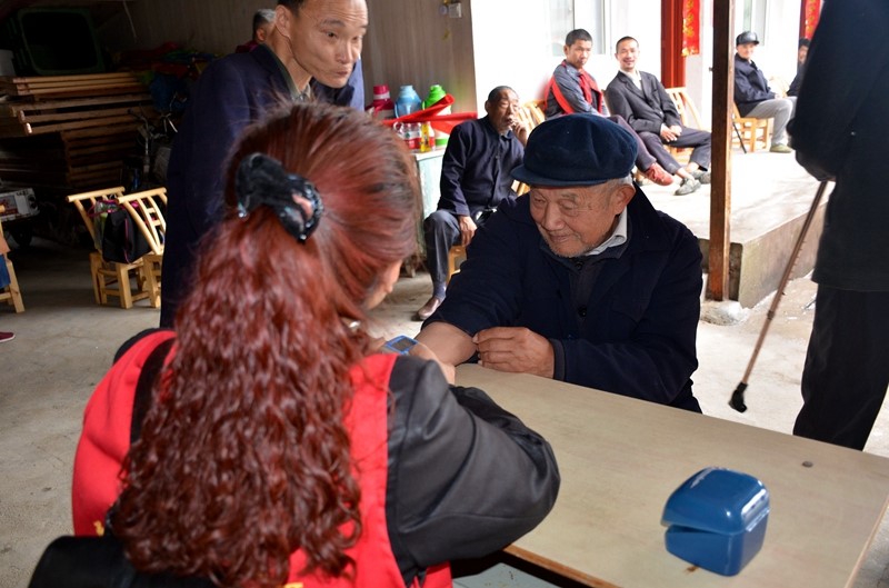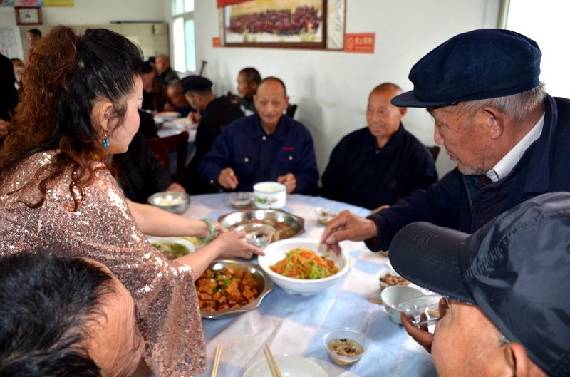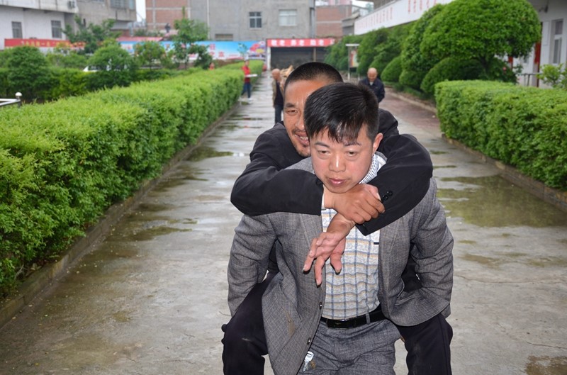 黄久生敬老院院长余其龙背行动不便的老人前往用餐