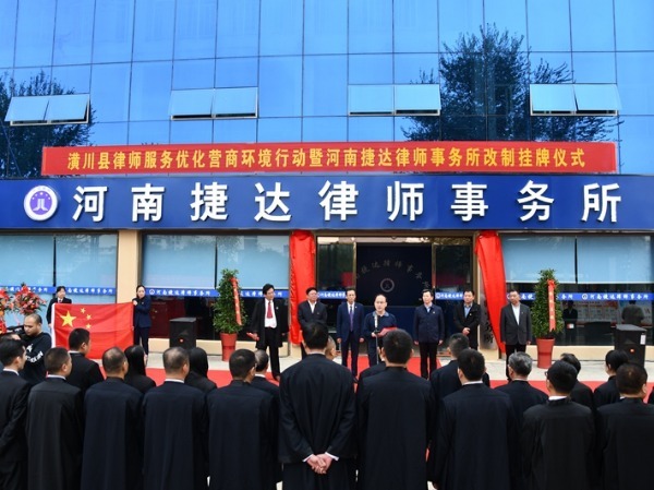 潢川网讯 10月12日上午,潢川县举行律师服务优化营商环境行动暨河南捷达律师事务所改制挂牌仪式。信阳市司法局副局长、市律协党委书记缪克富,县委常委、县委政法委书记陈旭东,信阳市司法局律师管理科科长王磊,信阳市律师协会党委副书记、会长孔涛,县司法局全体班子成员及各股室负责人、各司法所所长及众卓律师事务所、捷达律师事务所的全体律师参加仪式。仪式由县司法局局长张能健主持,县委常委、县委政法委书记陈旭东作
