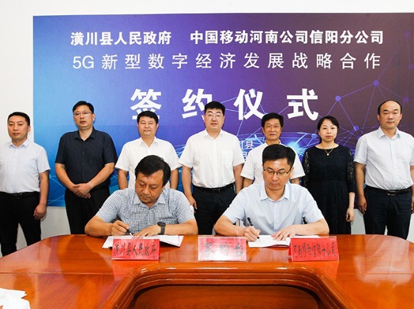 潢川网讯 9月10日上午,潢川县人民政府与中国移动信阳分公司《联合推进5G新型数字经济发展战略合作框架协议》签约仪式在县政府三楼会议室举行。信阳移动党委书记、总经理王磊,副总经理王明君,副总经理张振,县领导兰恩民、赵军华、李浩、胡峰出席签约仪式,相关职能部门负责人参加签约仪式。