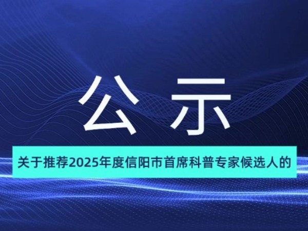 根据《关于开展2025年度信阳市首席科普专家推荐工作的通知》(信科协字〔2025〕14号)文件精神,潢川县科协严格按照评选条件,认真组织开展宣传动员和推荐工作。经各单位推荐,现对拟推荐的齐洋等6名2025年信阳市首席科普专家候选人进行公示。
