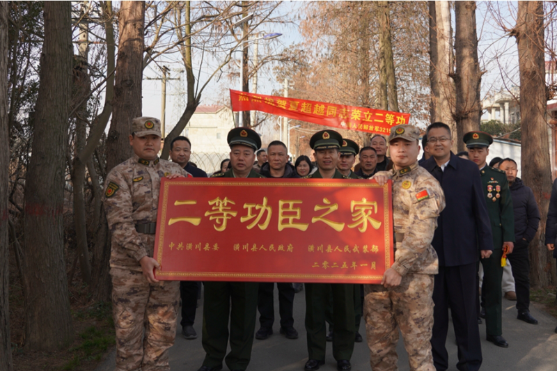 本网讯 1月8日上午,潢川县定城街道锣鼓喧天、热闹非凡。县委常委、县人武部领导曹书斌,县政府副县长、县公安局局长陈勇,与县退役军人事务局、定城街道和32152部队领导等一道,共同为现役军人夏超越一家送去二等功喜报。