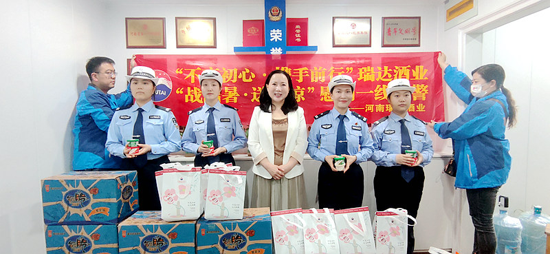 本网讯 2023年5月4日上午,在五四青年节到来之际,河南瑞达酒业有限公司负责人胡瑞红一行到潢川县航空路女子交警岗,为坚守一线的执勤人员送来茅台冰淇淋、方便面、矿泉水、大米等慰问品,献上企业的一片爱心,彰显企业责任担当。