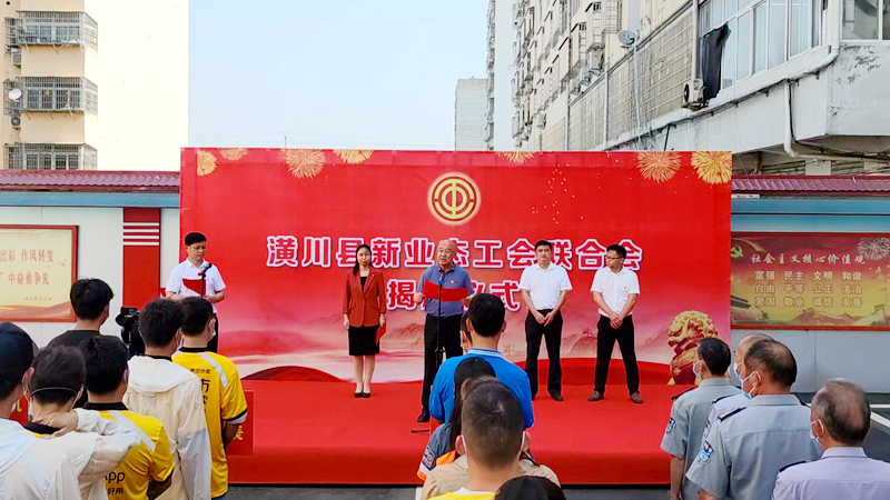 潢川网讯 6月14日,潢川县新业态工会联合会在县总工会揭牌成立。信阳市总工会党组成员、副主席周明勇,潢川县人大常委会副主任、总工会主席齐新峰,县政府副县长廖文燕出席仪式。仪式由县总工会党组书记、副主席李强主持。