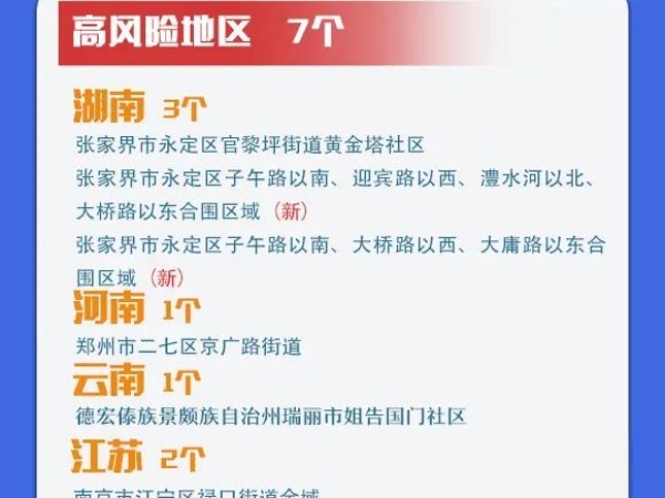 全国(不含港澳台)疫情中高风险地区名单(共196个)截至2021年8月7日15时高风险地区(7个)湖南省(3个)张家界(3个)永定区官黎坪街道黄金塔社区永定区子午路以南、迎宾路以西、澧水河以北、大桥路