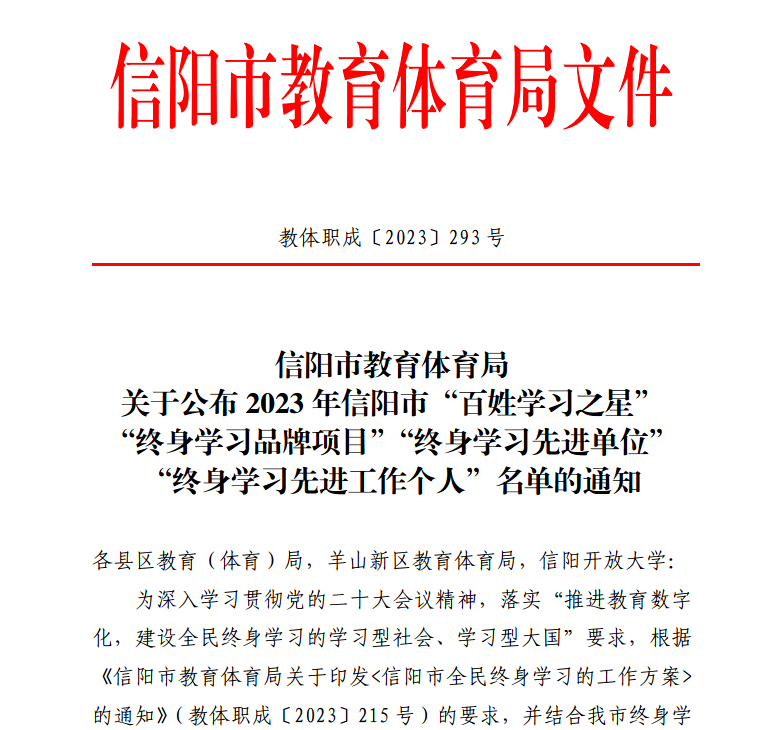 本网讯(瓮启兵 王刘影)近日,潢川县教体系统在全市范围内荣获多项“终身学习”荣誉。这是该县深入学习贯彻党的二十大会议精神,落实“推进教育数字化,建设全民终身学习的学习型社会、学习型大国”要求的具体体现。