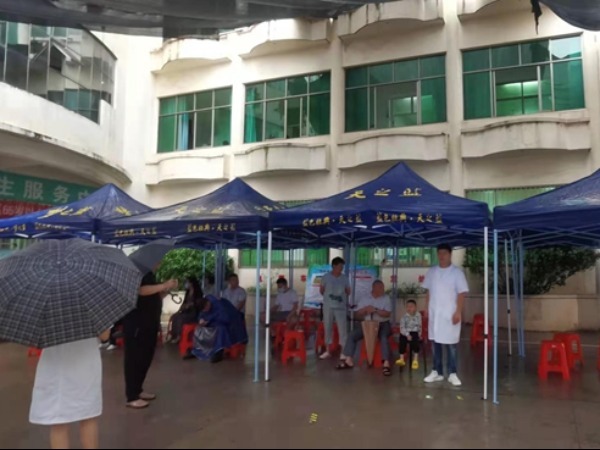潢川网讯 进入七月,一直位于本轮江淮、江南降雨而又处于雨中地带的河南潢川县,受连日持续大到暴雨的影响,给正紧锣密鼓而秩序井然的新冠疫苗接种工作带来非常不便。面对这种极端恶劣天气,潢川县妇联、潢川县公之益志愿服务协会急疫苗接种点之所急,帮接种群众之所需,携手江苏洋河酒厂“天之蓝”潢川区域总经销,把该企业购买的移动帐篷及时送到有急切需求的新冠疫苗接种点,旨在解决接种点接种群众的雨中之忧,被接种医院的领