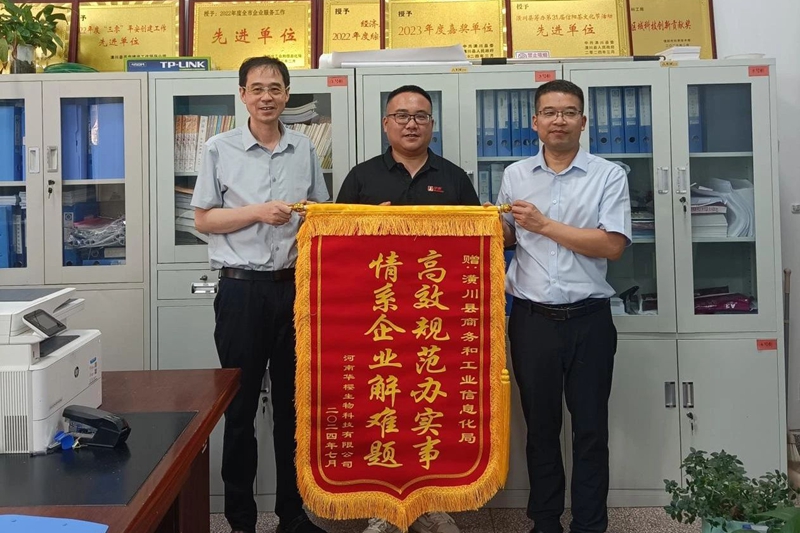 本网讯 7月29日,河南华樱生物科技有限公司的代表满怀感激之情,将一面绣有“高效规范办实事 情系企业解难题”的锦旗郑重地送到了县商务和工信局,这一温馨场景成为了政企合作、服务基层的生动写照。