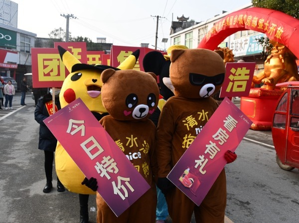 潢川网讯 2020年11月27日上午,潢川县踅孜镇中心街锣鼓喧天,热闹非凡,浩华清水湾/华英书院乡镇售房部以一场大型巡游展,正式亮相踅孜镇,4个卡通人物及浩华员工组成的方阵巡游活动,将这个喜讯传递在踅孜镇中心街道的各个角落。