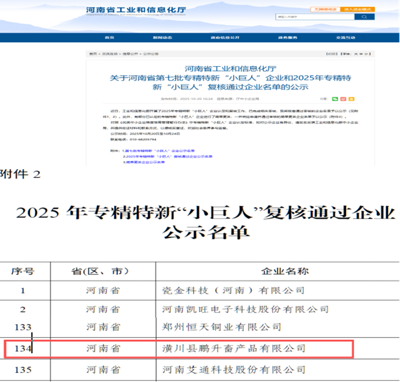 本网讯 日前,从省工信厅网站获悉,在最新发布的公示名单中,潢川县重点培育的国家级专精特新“小巨人”企业“潢川县鹏升畜产品有限公司”成功通过工信部复核。这一重要成果,是县长期以来坚持工业强县战略、深耕优质中小企业梯度培育工作的生动体现,也为全县工业经济高质量发展注入了强劲信心。