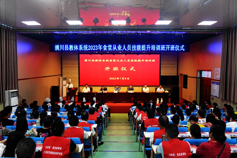 本网讯 为贯彻落实终身职业技能培训制度,积极响应当前教育事业发展需要,7月8日上午,潢川县教体系统2023年食堂从业人员技能提升培训班开班仪式在县职业中专多媒体报告厅举行。县人社局党组书记、局长刘勇,县教体局党组书记、局长胡波,县市场监管局党组成员、副局长万强,县教体局党组成员、副局长侯黎明,县教体局党组成员、副局长、招办主任吴昱,县职业中专学校校长孟祥欢出席仪式,来自全县各级各类学校食堂食堂从业